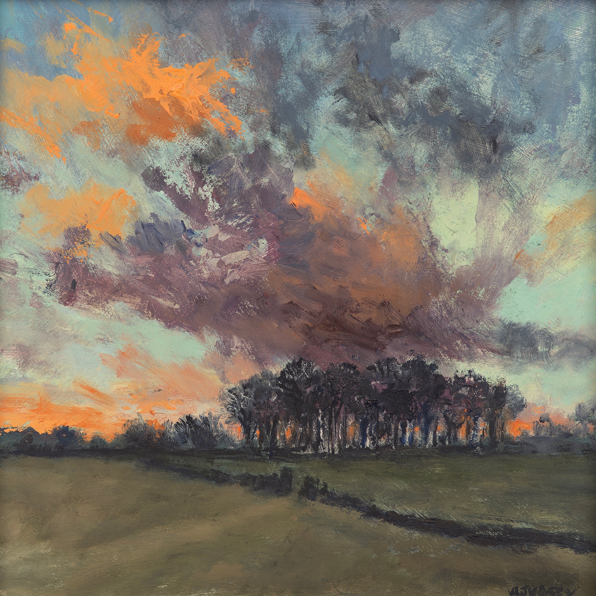 The "pop" of orange is a beautiful highlight in this sunset painting with hues of purple and pale turquoise in the sky. The location is the view from Arbor Low just outside of Buxton, Derbyshire at dusk.
