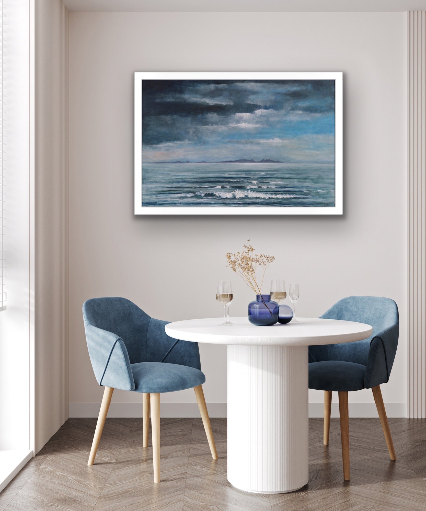 This calming semi - abstract original oil painting is inspired by the view from Talisker Bay to the Outer Hebrides. I'm fascinated by the ever changing light and atmosphere created over the sea - these islands have an air of intrigue and mystery and I love the fact that sometimes they are visible, sometimes you would not know they are there. I love the calm of this scene with the close hues of blue with a contrast of pale yellow and pink. The clouds are gathering, but the sunlight just reaching through to light up the sea below.